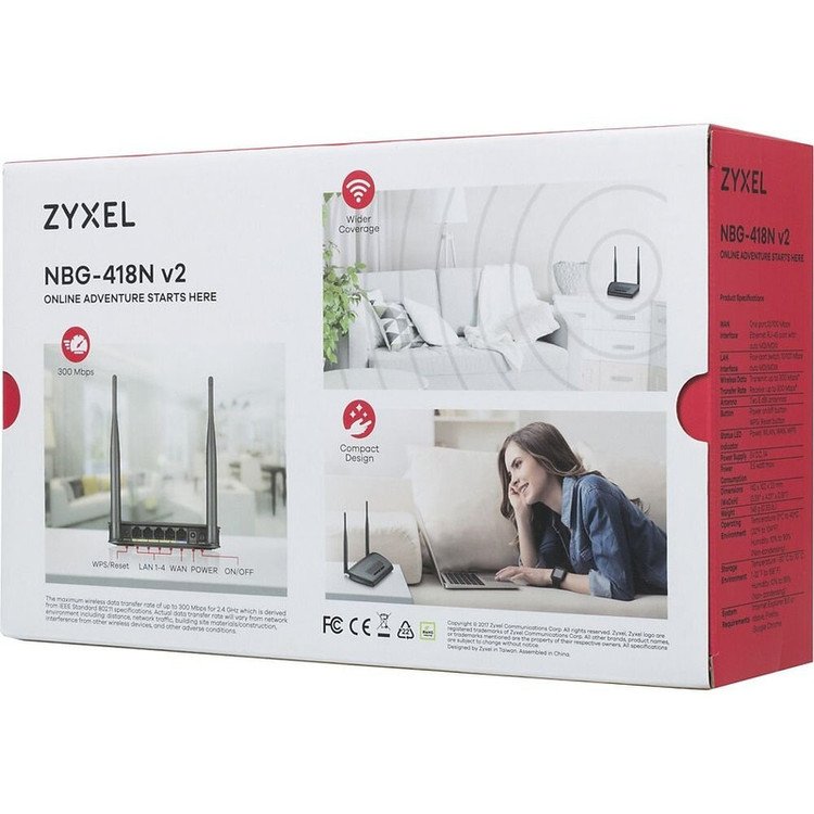 روتر بی سیم زایکسل مدل NBG-418N قابلیت اشتراکگذاری و اتصالات آسان شبکه های خانگی وایرلس را دارد و از دو آنتن 5 دسیبل برای انتقال باثبات داده ها و پوشش وسیعتر و چهار درگاه شبکه اترنت 10/100،یک درگاه WAN 10/100 بهره می برد. این محصول دارای مدیریت آسان شبکه شما به همراه امکان کنترل والدین (parental control) بوده و در ابعاد 23 x 102x 142 میلیمتر و با وزن 148 گرم تولید شده است و در بازار تجهیزات شبکه با طراحی عالی می توانید خریداری کنید. این روتر وایرلس سازگار با سیستم عامل های Windows 8.1, Windows 8, Windows 7, Windows Vista, Windows 98SE, Windows NT, Windows 2000, MAC OS , NetWare, UNIX و Linux است. ولتاژ این روتر 5 ولت DC با جریان 1 آمپر با مصرف برق حداکثر 3.5 وات بوده و از نشانگر ال ای دی برای نمایش وضعیت روشن و خاموش بودن دستگاه (Power)، اینترنت(WAPS),(WAN) و دکمه کلید WPS و ریست ( WPS /Reset Button)، کلید روشن و خاموش کردن دستگاه (Power Button) بهره می برد. نرخ انتقال بی سیم در این مدل 300 مگابیت در ثانیه بوده و از استاندارد 802.11 b/g/n برخوردار است. از دیگر قابلیت های این روتر Zyxel می توان به قابلیت ایجاد چندین اسم شبکه (SSID) بصورت همزمان، قابلیت ارسال داده روی Modeهای مختلف، قابلیت تغییر اتوماتیک IP و تنظیمات روتر پس از تغییر Mode، قابلیت ست کردن کانکشن اینترنت بر روی اکسس پوینت و قابلیت محدودسازی پهنای باند برای سیستم های مختلف برای مدیریت پهنای باند اشاره نمود. Zyxel NBG-418N v2 با دو آنتن و قدرت گیرندگی 5dBi دامنه بی سیم گسترده تری را برای شما فراهم می کند تا از خدمات بی سیم در سراسر شبکه خانگی و حتی در حیاط خانه خود لذت ببرید و از اتصال بی سیم پایدار و قابل اعتماد برای مرور وب ، تبادل فایل و پخش چندرسانه ای در همه جای خانه لذت خواهید برد. همچنین همراه با این کالا یک عدد کارت هدیه اشتراک 1 ماهه نماوا به مشتری تقدیم می گردد