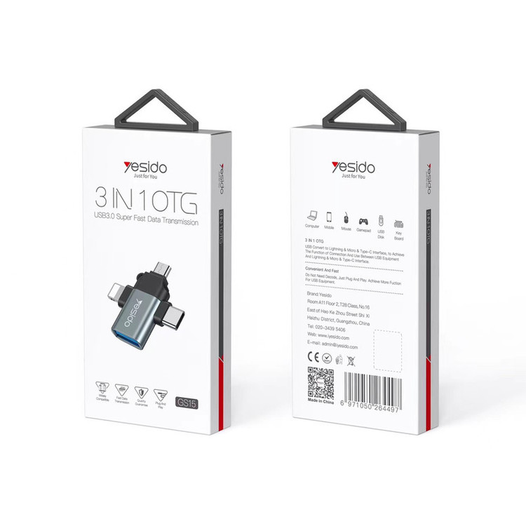 شرکت یسیدو از تولید کننده های خوشنام دنیای دیجیتال و لوازم جانبی، مبدل میکرو یو اس بی تایپ سی و لایتنینگ سه در یک یسیدو را تولید کرده است تا کاربران بتوانند انواع لوازم جانبی اعم از فلش مموری ، موس ، کیبرد و .... را به کلیه گوشیهای اندرویدی با قابلیت پشتیبانی از OTG و کلیه گوشیهای آیفون از سری 6 به بالا بدون نیاز به هیچگونه نرم افزار متصل کنند. مبدل میکرو یو اس بی تایپ سی و لایتنینگ یسیدو GS15 ابعاد بسیار کوچکی داشته و فضای زیادی اشغال نمی کند، در نتیجه به راحتی می توان آن را در کیف حمل کرد. بنابراین کاربران برای استفاده از آن مشکلی نخواهند داشت و حمل این مبدل مزاحمتی ایجاد نمی کند.جنس بدنه این مبدل فلزی و از آلیاژ روی ساخته شده است ، بدلیل پشتیبانی از USB3 ، سرعت انتقال دیتا بالا میباشد .سرعت انتقال دیتا بسته به سرعت فلش مموری شما تا 150 مگابایت در ثانیه متغیر میباشد ، همچنین با کمک این محصول اتصال کیبرد ، موس و گیم پد به گوشی و تبلت آیفون میسر میگردد .از ویژگیهای این محصول قابلیت اتصال دوربینهای عکاسی و فیلمبرداری با پشایبانی از OTG به گوشی شما میباشد .نحوه کار برای گوشیهای آیفون بدین صورت میباشد که پس از اتصال فلش مموری از طریق مبدل یسیدو مدل GS15 وارد برنامه FILE (آیکون پوشه آبی که بصورت پیش فرض جزو برنامه های IOS میباشد) شده و فلش مموری شما به عنوان یک درایو جدا شونده به مکانهای قابل ذخیره ( خواندن و نوشتن) در گوشی شناخته میشود .
