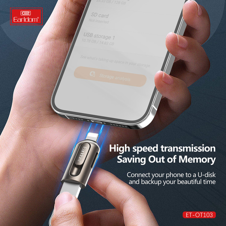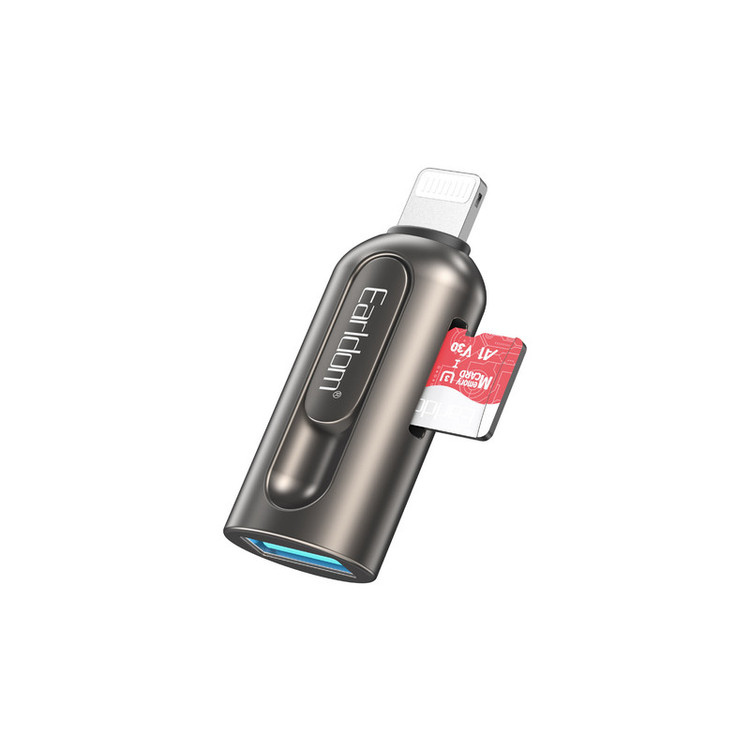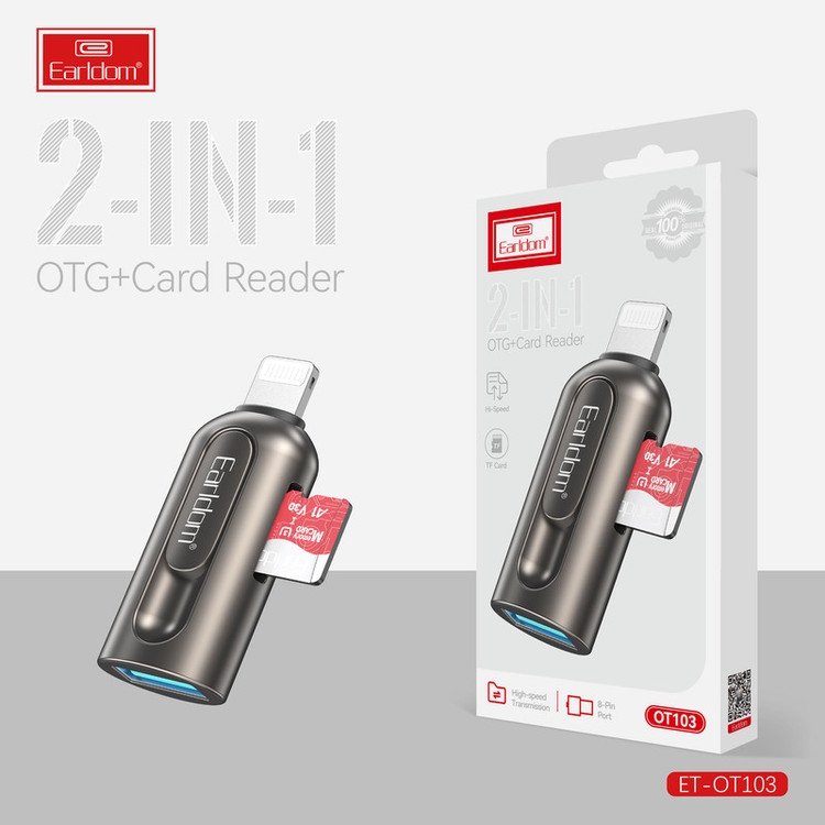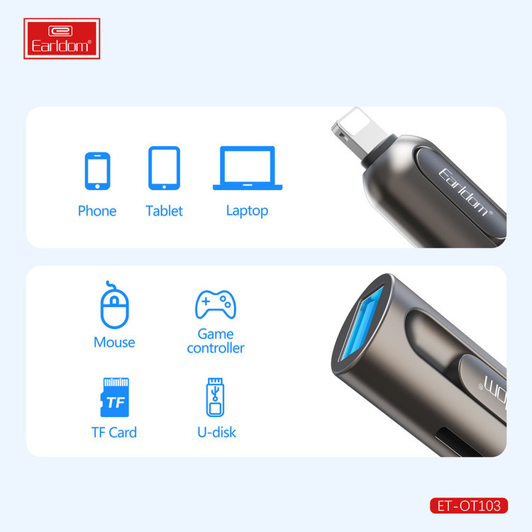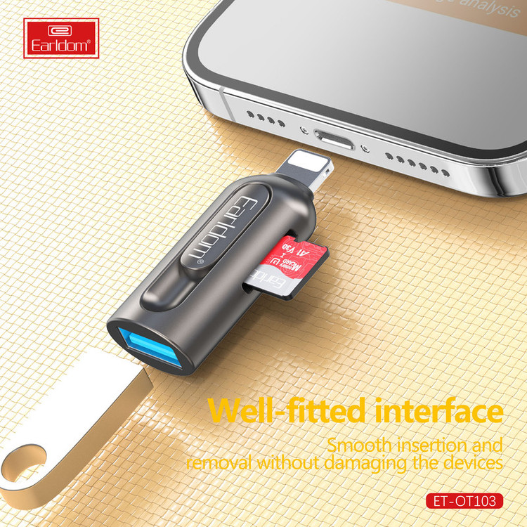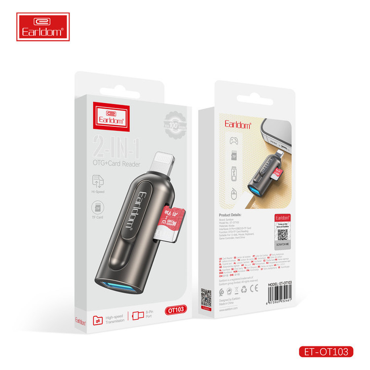جا به جایی اطلاعات از گوشی به کارت حافظه و برعکس جزو کارهایی است که اغلب کاربران موبایل با آن روبرو هستند و برای انجام اینکار نیاز به یک رابط و مبدل است. ارلدام با طراحی و ساخت یک رابط او تی جی لایتنینگ که مخصوص کابران گوشی های آیفون و تبلت شرکت اپل است اینکار را آسان کرده است. مبدل او تی جی ارلدام مدل ET-OT103 ابعادی به اندازه یک فلش مموری دارد و به راحتی داخل جیب یا کیف پولتان جای می گیرد. جنس بدنه ی این محصول از آلیاژ آلومینیوم ساخته شده است و در برابر خوردگی و خراشیدگی بسیار مقاوم است. یک طرف این مبدل رابط لایتنینگ و طرف دیگر پورت USB است، روی بدنه این مبدل یک شیار کارت خوان TF نیز وجود دارد.همانطور که در بالا اشاره کردیم روی بدنه ی این او تی جی آیفون یک شیار کارت خوان وجود دارد که شما می توانید کارت حافظه را مستقیما روی آن قرار دهید و اطلاعات موجود روی مموری کارت را به گوشی آیفون و یا برعکس انتقال دهید. شما می توانید کانکتور لایتنینگ این مبدل را به گوشی آیفون، مک بوک و یا آیپد و از طرف دیگر دستگاه هایی مانند موس، گیم کنترلر، فلش مموری و غیره را متصل نمایید.