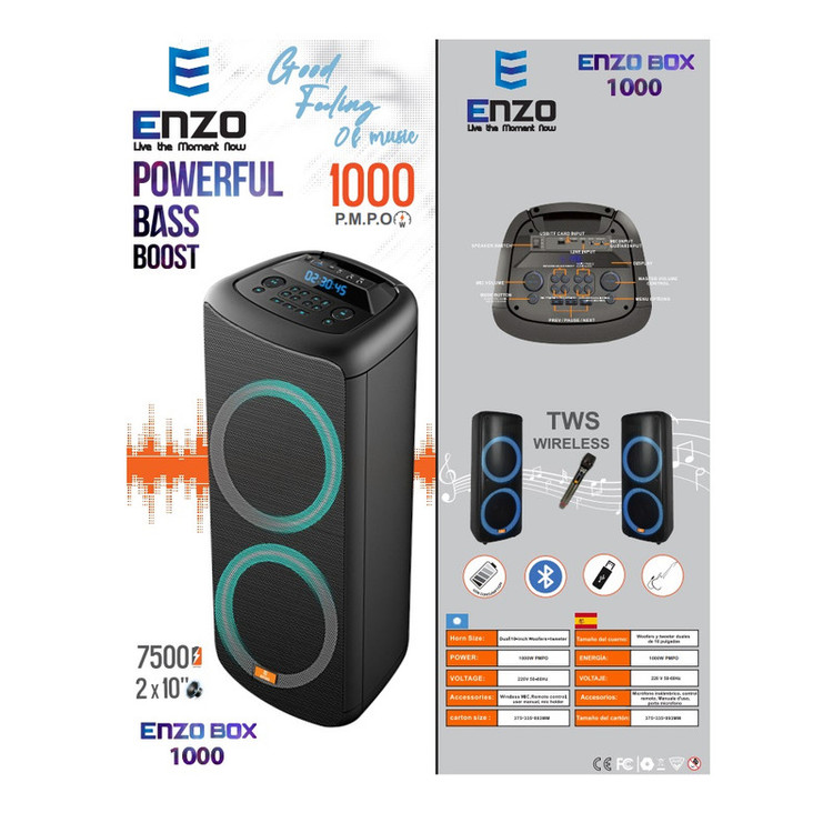 اسپیکر پارتی باکس 1000 طراحی شده در شرکت ENZO میباشد. این اسپیکر با کیفیت بالای بدنه و صدای شفاف و قدرتمند باعث جذابیت در آن شده. LED های RGB این دستگاه جلوه زیبایی به مراسم های شما میدهد و شما میتوانید از میکروفن آن به صورت بی سیم استفاده کنید و دارای قابلیت TWS (شما میتوانید همزمان دو اسپیکر PARTY BOX 1000 را بهم متصل کنید و به آن متصل شید و صدای موزیک را از هر دو اسپیکر بشنوید) میباشد.ظرفیت باتری این اسپیکر 7500mah میباشد. شما میتوانید از طریق TF-CARD MICROPHON AUX GUITAR INPUT USB BLUTOOTH به دستگاه متصل شوید و از پخش صدای آن لذت ببرید.این اسپیکر دو ساب 10 اینچ میباشد و با ابعاد 375x335x893 و وزن 15.2kg ساخته شده است و دارای کنترل از راه دور دفترچه راهنما آداپتور هولدر نگه دارنده میکروفن میباشد. توان خروجی کلی این اسپیکر 1000w و توان خروجی واقعی آن 100w میباشد. محصولات انزو به صورت کاملا قانونی و دارای لیبل شناسه کالا از وزارت سمت و همچنین مورد تایید استاندارد ملی میباشد.امیدواریم از شنیدن موسیقی با محصولات انزو نهایت لذت را ببرید.
