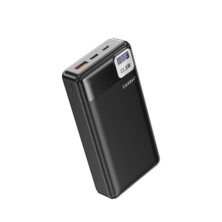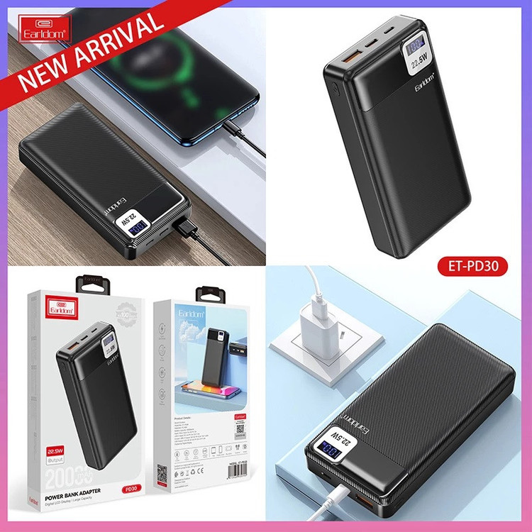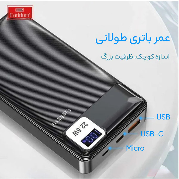 پاوربانک ارلدام PD30 یکی از جدید ترین مدل های این برند است که پاوربانکی قدرتمند و کامل به حساب می آید. خروجی این مدل ، 22.5 وات است. بر روی پنل جلویی ، یک LCD برای نمایش درصدی میزان شارژ پاوربانک ، قرار دارد که جلوه ای حرفه ای نیز به پاوربانک بخشیده است. در بالای پاوربانک 3 درگاه جای گرفته است ؛ USB ، PD (Type-C) و MicroUSB. درگاه USB دارای خروجی حداکثری 4.5 آمپر است که برای شارژ نمودن طیف گسترده ای از انواع موبایل ، تبلت ، هدفون و ... ایده آل است. درگاه تایپ سی از نوع PD است یعنی در واقع هم می تواند درگاه خروجی باشد و شارژ بدهد و هم از طریق این درگاه پاروبانک را به صورت شارژ سریع ، شارژ نمود. حداکثر شدت جریان این درگاه نیز در حدود 3.0 آمپر است. درگاه MICROUSB ( اندرویدی ) ، 1 درگاه ورودیست و می توان ازین طریق ، پاوربانک را شارژ نمود. درون بسته بندی ، 1 عدد کابل پاوربانک تایپ ی نیز جای گرفته است.