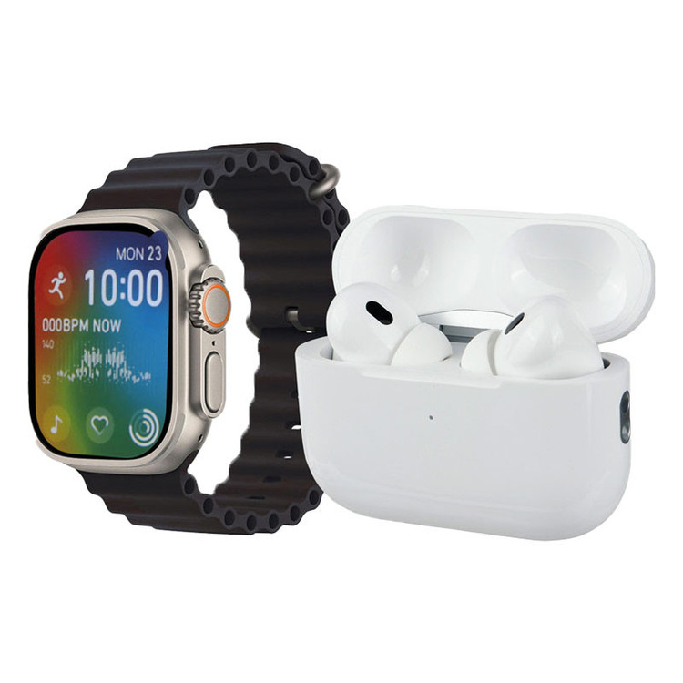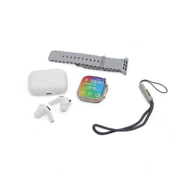 این مجموعه شامل 1عدد اسمارت واچ، 1عدد هندزفری بلوتوث دو تایی، کیس شارژ هندزفری، 1عدد بند، 1عدد شارژر بی سیم ساعت، 1عدد کابل لایتنینگ