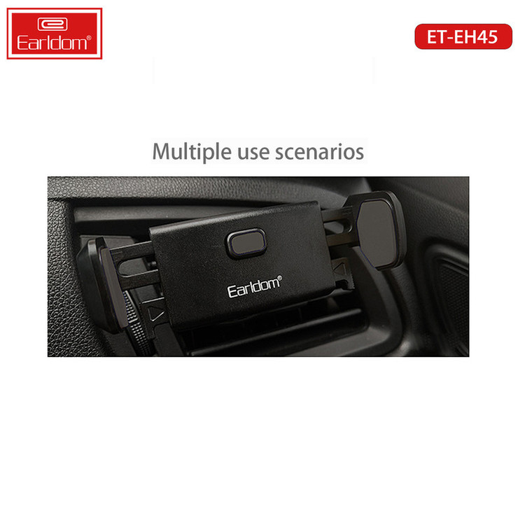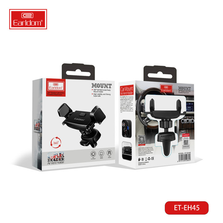 ارلدام شرکتی بسیار فعال در زمینه تولید انواع لوازم جانبی موبایل است و دستی هم در تولید هولدر گوشی دارد؛ نگهدارنده موبایل خودرو ارلدام Earldom Car Mount ET-EH45 نمونهای از تولیدات این شرکت بوده و برای استفاده در خودرو طراحی شده است. این هولدر گوشی همراه ارلدام برای نصب در دریچه کولر خودرو طراحی شده و با توجه به ابعاد و وزن سبکی که دارد آسیبی به درچه نرسانده و مزاحمتی برای دید راننده ایجاد نمیکند. کیفیت هولدر گوشی دریچه کولر ارلدام را پلاستیک با کیفیت ABS تضمین میکنند و از دوام بسیار بالایی در برابر آسیب و ضربه برخوردار است. سیلیکون به کار رفته در بازوهای آن هم از آسیب به گوشی و ایجاد خطوخش جلوگیری میکند. همانگونه که در بالا اشاره شد قابل نصب در دریچه کولر خودرو بوده و بسیار جمعوجور است؛ سازگار با گوشیهایی با ابعاد 3.5 تا 6 اینچ است. امکان قرار دادن گوشی همراه با یک دست برای شما فراهم است. ارلدام با توجه به نیازتان قابلیت چرخش 360 درجهای را برای این هولدر ماشین درنظر گرفته تا امکان چرخش برای شما فراهم باشد و گوشی را در حالت افقی یا عمودی قرار دهید.