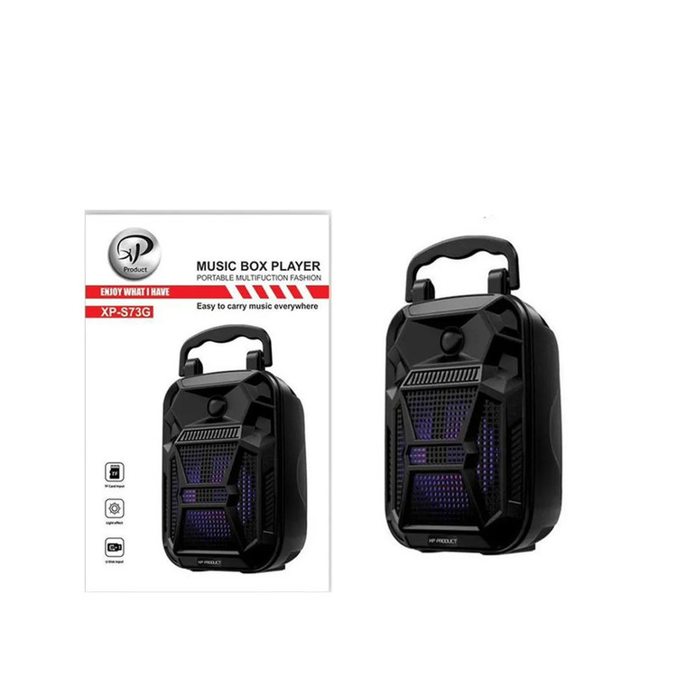 اسپیکر XP مدل S73G یک پخش کننده صوتی به صورت بی سیم و بلوتوثی با بردی به طول 10 متر طراحی شده است. این اسپیکر از طریق پورت USB ،TF Card و بلوتوث به گوشی تلفن همراه یا دیگر پخشکنندهها متصل می شود. این اسپیکر شامل کلید روشن / خاموش ، Mode ، کنترل پخش موسیقی می باشد. این اسپیکر بی سیم به قابلیت TWS نیز مجهز شده که اتصال 2 عدد از این اسپیکر هم نوع را به یک دستگاه واحد بلوتوثی برقرار می کند تا آهنگ در حال پخش با صدایی قدرتمندتر به صورت همزمان از هر دو اسپیکر به گوش برسد. اسپیکر بلوتوثی S73G دارای موج رادیویی Fm که امکان استفاده از آن را برای علاقمندان به رادیو فراهم کرده است. قابلیت شارژ مجدد این اسپیکر توسط کابل و پورت Micro USB انجام می شود.