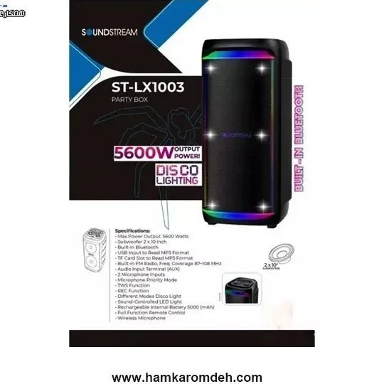 مشخصات کلی جنس بدنه پلاستیک تعداد سابووفر 2 عدد سایز سابووفر 10 اینچ باتری 5000 میلی آمپر رقص نور دارد میکروفون دارد سایر امکانات Max.Power Output :5600 watts , subwoofer 2×10 inch , Built - in bluetooth, USB input to Read MP3 Format , TF Card Slot to Read MP3 Format , Built -in FM Radio freq. Coverage 87~108 MHz , Audio Input Terminal (AUX) ,2Mictophone Inputs ,Microphone Priority Mode , TWS Function , REC Function , Different Modes Disco Light , Sound-Controlled LED Light , Rechargeable Internal Battery 5000 (mAh) , Full Function Remote Control , wireless Microphone