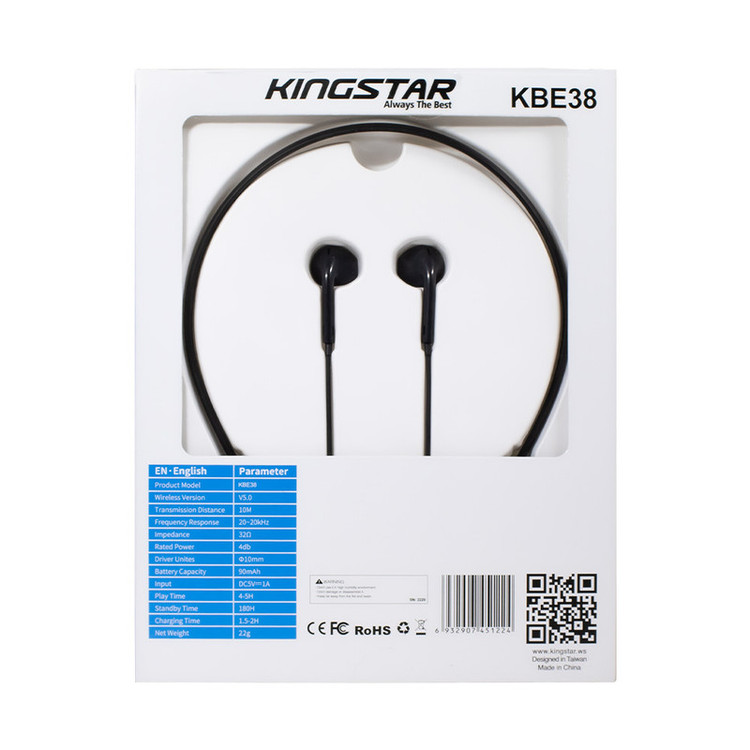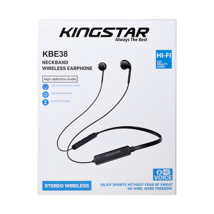 یکی از کالاهای پراستفادهی کاربران که موجب شده تا جای هندزفریهای قدیمی را بگیرد، ایرفونها هستند. کمپانی کینگ استار در راستای تولیدات با کیفیت و پرفروش خود در زمینهی هدفون و هندزفری، اقدام به تولید و عرضهی محصولی مطابق با استانداردهای جهانی و پرکاربرد کرده است. ایرفون بلوتوثی کینگ استار مدل KBE38 در دسته ایرفونهای دورگردنی که عموماً با نام نکبند میشناسند، قرار میگیرد.یکی از ویژگیهای کاربردی ایرفون (نکبند) بلوتوثی کینگ استار مدل KBE38 میتوان به نگهدارنده گردنی انعطاف پذیر آن اشاره کرد که میتواند تاثیر بسزایی در نگهداری و افزایش طول عمر محصول داشته باشد. علاوه بر آن، این محصول مجهز به پنل مدیریت صدا و پاسخگویی به تماس است و کیفیت و حجم صدای خروجی قابل قبولی دارد. انرژی مورد نیاز آن نیز از طریق باتری داخلی تامین میشود. همچنین این ایرفون مشکی رنگ با طراحي بسيار زيبا با جنس بدنهی پلاستیک نرم و قطر درایور 10 میلیمتر از وزن نسبتا کمي با مقدار 22 گرم برخوردار است. اين امر باعث ميشود، کاربر با استفادهي طولاني مدت خسته نشود. جنس قسمت دورگردني اين ایرفون، انعطاف پذير است و از شکسته شدن در طول فعاليتهاي روزانه جلوگيري ميکند.پاسخ به تماسهای تلفنی و پخش آهنگ فقط با فشردن یک دکمه برای شما امکان پذیر است. شما میتوانید برای استفاده از ایرفون وایرلس KBE38 توسط بلوتوث نسخه 5.0 با محدوده عملکرد 10 متر به آن متصل شوید. امپدانس و فرکانس این ایرفون به ترتیب 32اهم و 20هرتز الی 20کیلوهرتز میباشد. از دیگر ویژگیهای این ایرفون میتوان بیان کرد که از طریق بلوتوث به گوشی همراه شما متصل میشود بنابراین شما را از قید و بند کابلهای صوتی رها میسازد. دارای یک پورت تایپ سی جهت اتصال کابل شارژر نیز میباشد.ظرفیت باتری این کالا 90 میلی آمپر ساعت میباشد که موحب شده تا زمان پخش موسیقی آن به 4 الی 5 ساعت و عمر باتری درحالت استندبای به 180 ساعت برسد. همچنین مدت زمان شارژ شدن این محصول با ورودی 5ولت 1 آمپر حدود 1.5 الی 2 ساعت میباشد. دکمههاي کنترل بلندي صدا نيز بر روی این ایرفون تعبيه شده است که قابليت به جلو و يا عقب دادن موزيکها را دارا ميباشد.