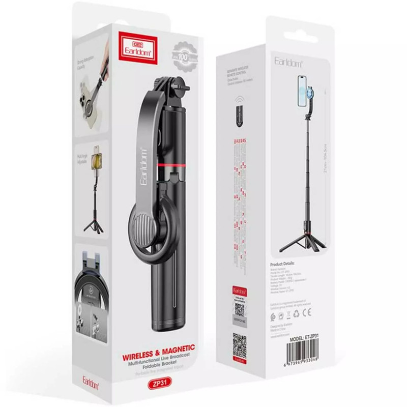 این محصول با طراحی پیشرفته و کیفیت ساخت عالی، تجربهای بینظیر از عکاسی و فیلمبرداری فراهم میآورد. از ویژگیهای برجسته آن میتوان به چرخش 360 درجه، قابلیت اتصال بلوتوث، ساختار مغناطیسی قوی و قابلیت استفاده بهعنوان سه پایه ثابت برای عکاسی پایدار اشاره کرد. این ویژگیها باعث میشود که ZP31 انتخابی ایدهآل برای افرادی باشد که به دنبال لوازم جانبی حرفهای و کارآمد برای گوشی موبایل خود هستند.این محصول (ZP31 ) بدنهای از جنس پلاستیک ABS و آلیاژ آلومینیوم دارد. ارتفاع این پایه موبایل در حالت باز 104.5 سانتی متر و در حالت بسته 18.5 سانتی متر بوده؛ ابعاد آن 210*58*54 میلیمتر بوده و وزن 180 گرمی این سه پایه باعث شده تا به راحتی بتوانید از آن به عنوان یک دسته سلفی یا همان مونوپاد نیز استفاده کنید. ویژگی سه پایه موبایل سلفی ZP31 یکی از مهمترین مزایای این محصول است که به آن امکان استفاده حرفهای و پایدار را میدهد. در بسیاری از مواقع، هنگام عکاسی از دور یا فیلمبرداری، لرزش دست میتواند باعث خراب شدن کیفیت تصویر شود. با استفاده از سه پایه ZP31 شما میتوانید از این مشکل جلوگیری کنید و بهراحتی عکسها و ویدیوهایی با وضوح بالا و بدون لرزش داشته باشید. همچنین، این سه پایه به شما این امکان را میدهد که بدون نیاز به کمک دیگران، عکسها و ویدیوهای گروهی، سلفیهای حرفهای یا حتی زمانسنجیهای طولانیمدت بگیرید. طراحی مناسب و محکم سه پایه، آن را برای استفاده در هر شرایطی، از جمله روی زمین یا سطوح ناصاف، مناسب میکند. هولدر مگنتی یکی از راحتترینهای بین انواع هولدر موبایل است؛ این محصول ارلدام هم این ویژگی را داراست و با استفاده از نیروی مغناطیسی 49 نیوتن پیشرفته، امکان قرار گرفتن گوشی روی پایه را بهراحتی و با ثبات کامل فراهم میآورد. بهطور خاص، یک سیستم مغناطیسی قوی در طراحی این چوب سلفی تعبیه شده که به گوشی شما این امکان را میدهد که بهطور محکم و ایمن روی پایه قرار گیرد و حتی در شرایط مختلف حرکت یا تکان، گوشی ثابت و بدون لغزش باقی بماند. نسخه بلوتوث 4.2 در چوب سلفی Earldom ZP31 یکی از ویژگیهای مهم است که قابلیت اتصال بیسیم را بهبود میبخشد.